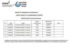 Qui pubblicate le convocazioni per il SCU progetto ” Geografie in Accoglienza” presso Comunità dei Giovani.